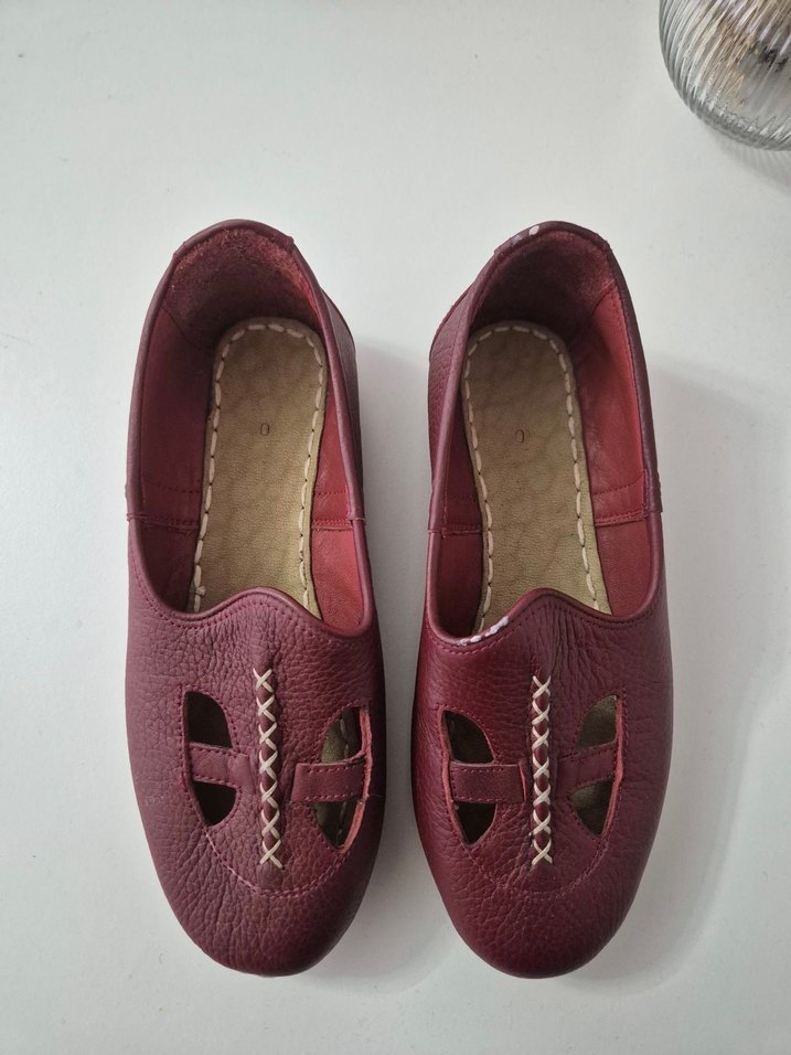 Bordo deri, blok topuklu kadın düz ayakkabı. Minimalist tarzda, bohem ve retro esintili, günlük kullanıma uygundur. Numarası görünmüyor fakat 38-39 numara uygun olur.