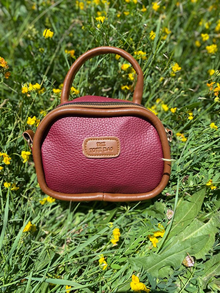 Bordo deri kadının mini çantası, fermuarlı ve kompakt tasarımıyla günlük kullanıma uygun, minimalist ve retro tarzda.