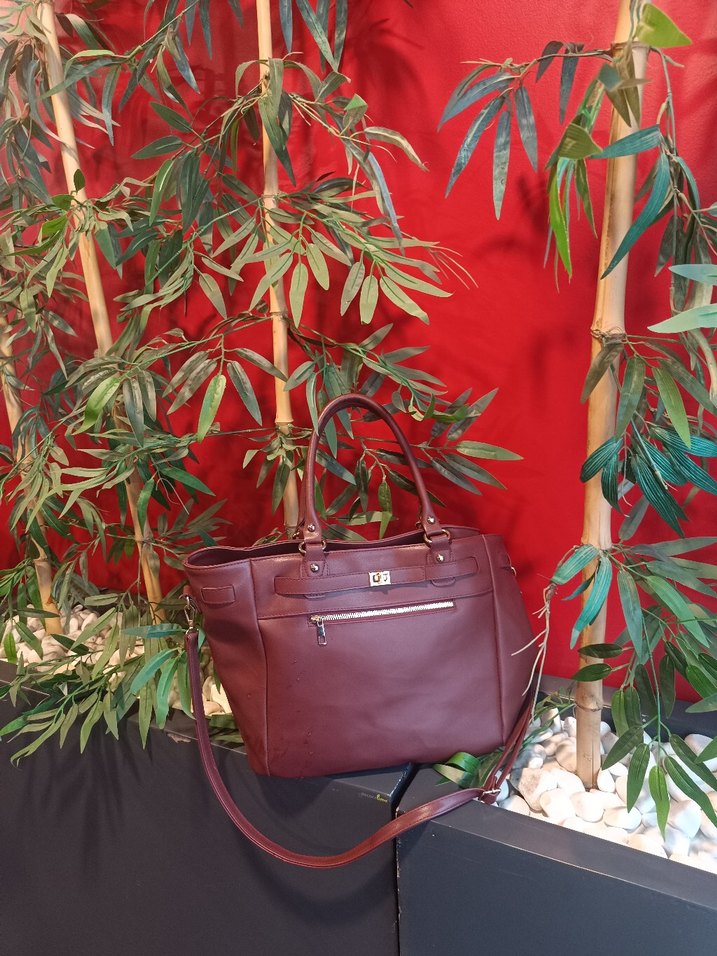 Bordo deri kadın çantası, tokalı detayları ve hem sap hem de askı özellikleriyle günlük kullanıma uygun, klasik Paris tarzını yansıtır.