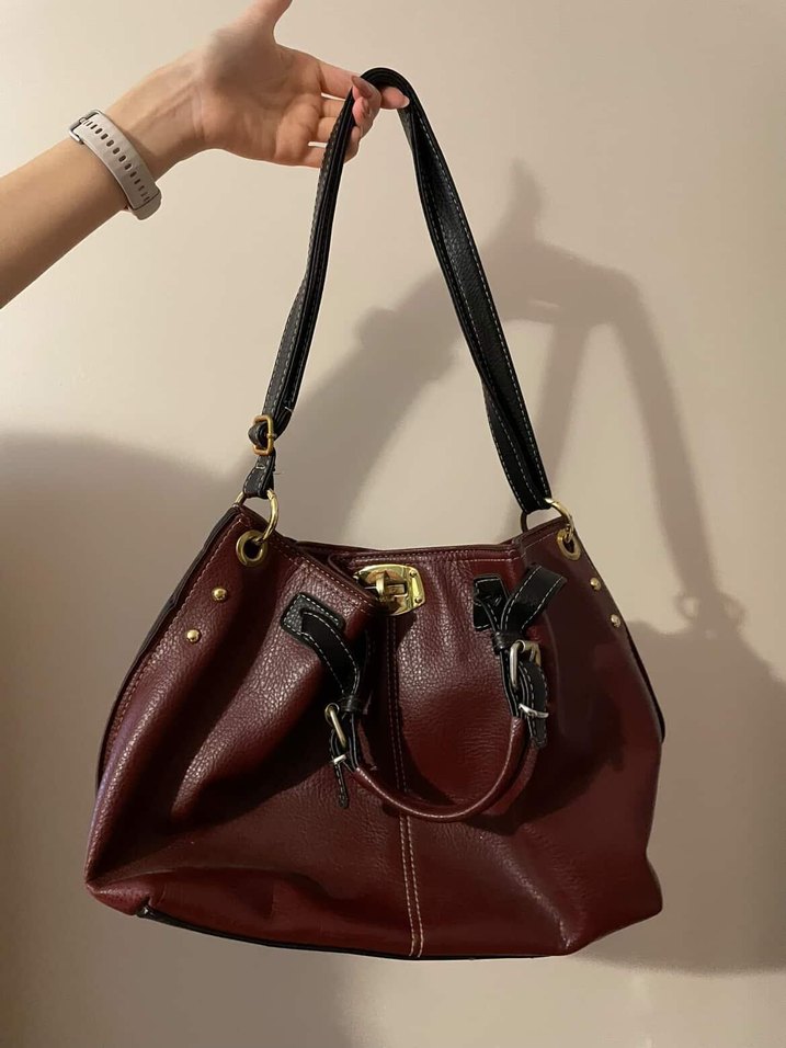 Bordo deri omuz çantası, tokalı detaylar ve parlak yüzeye sahip, Paris sokak modası tarzını günlük kullanıma uygun şekilde sunuyor.