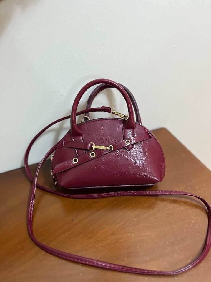 Bordo renkte, parlak deri kadın çantası. Hiç kullanılmamıştır