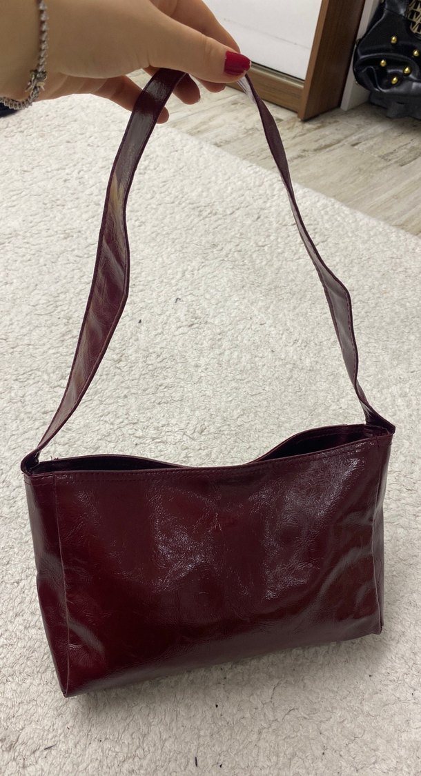 Bordo parlak deri kadın omuz çantası, minimalist ve çağdaş tasarıma sahip, günlük kullanıma uygundur. Düz ve desensiz şıklığıyla zahmetsiz şıklık sunar. Hiç kullanılmamıştır