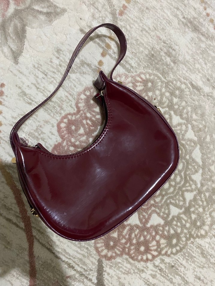 Bordo deri omuz çantası, parlak yüzey 1 kere kullanıldı çok yenidir