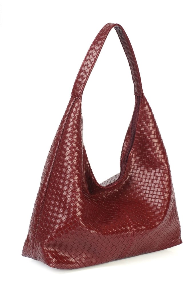 Bordo deri ve parlak yılan desenli, fermuarlı kadın omuz çantası. Bohem tarzıyla günlük kullanıma uygundur.