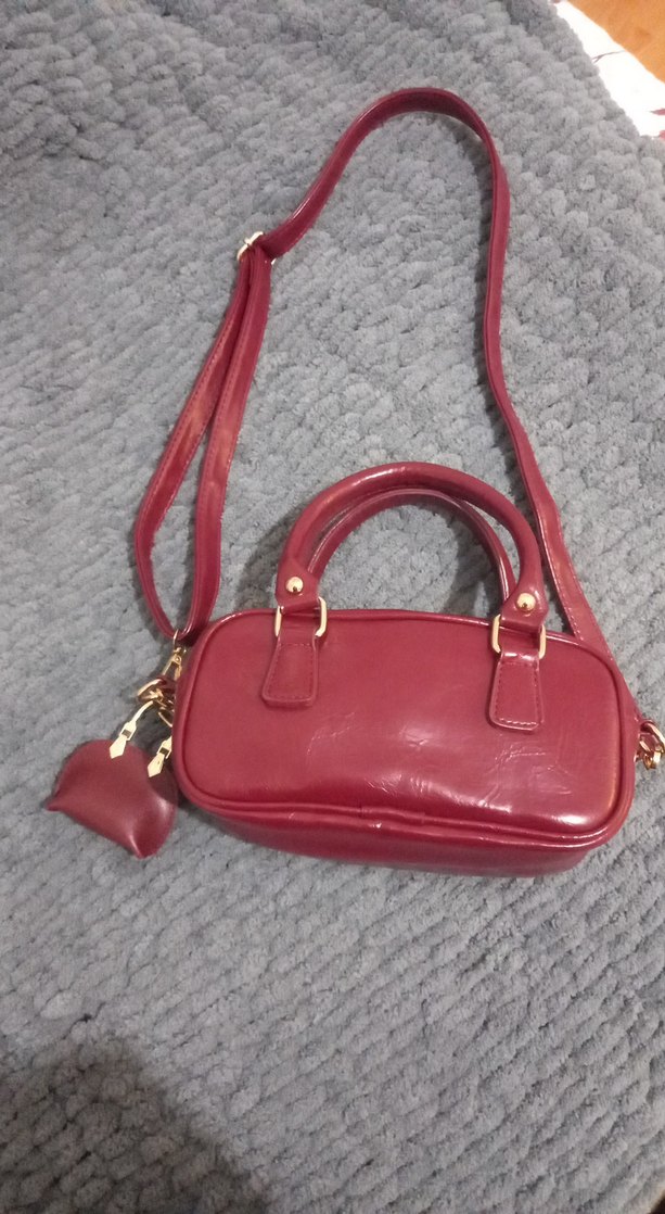 Bordo deri omuz çantası, parlak yüzey, fermuarlı bölmeler ve çıkarılabilir askıyla modern klasik tarz sunar.
