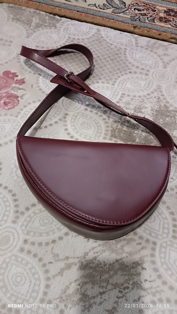 Bordo deri kadının omuz çantası, tokalı askısı ve desen içermeyen minimalist tasarımıyla günlük sokak stiline uygundur.