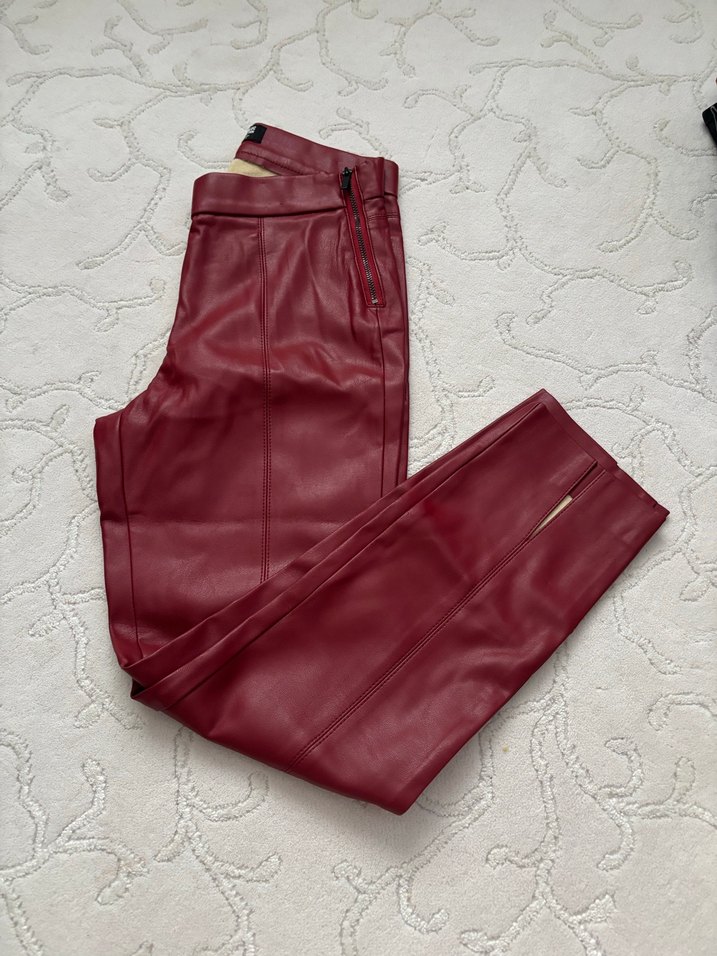 Bordo renk, deri kadın pantolon, normal boy ve düzenli kesim. Fermuar detaylarıyla minimalist ve sokak tarzı, ofis için uygun.24 beden