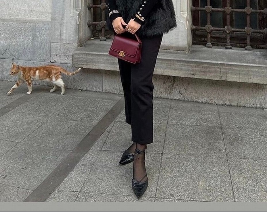 Deri, yılan desenli ve kürk detaylı, bordo renkte, normal boyda, regular fit kadın sigara paça pantolon. Ofis için uygun, trend görünümlü.milla markası