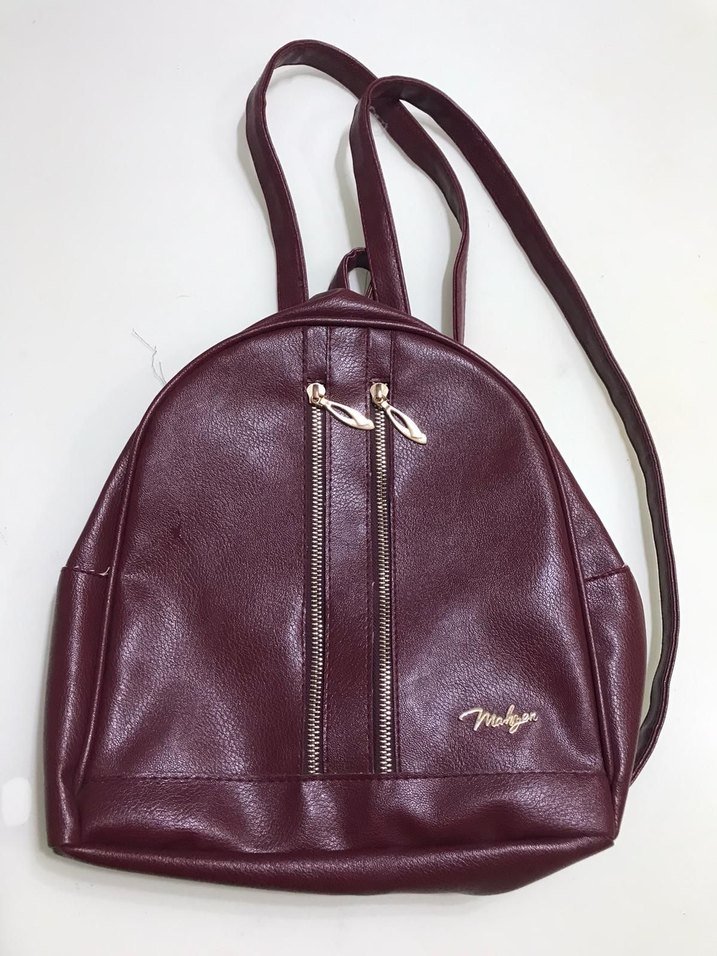 Bordo renkli, parlak deri sırt çantası, fermuarlı. Küçük boy. Tek göz. Aşırı yeni değil ama az kullanıldı.