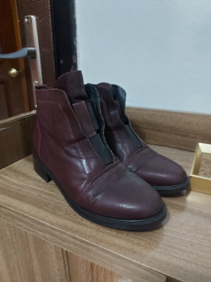 Bordo deri kadın bot, blok topuklu ve tokalı detaylı, günlük sokak stili için minimal tasarım.