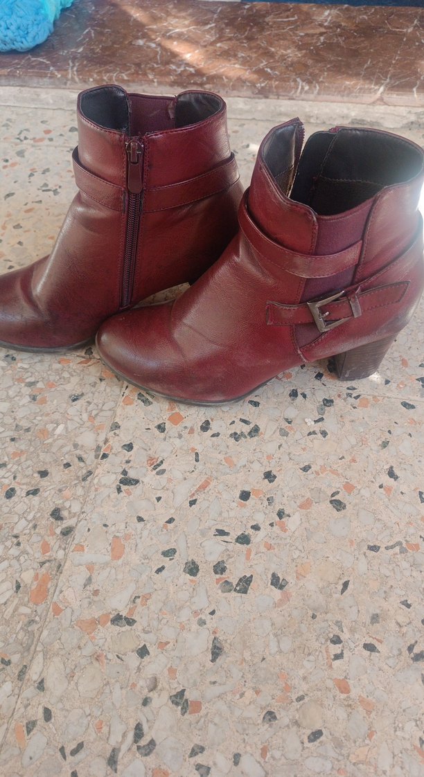 Bordo deri kadın bot, blok topuklu ve toka detaylı. Parlak yüzeyli, yan fermuarlı ve günlük şıklık için uygun.