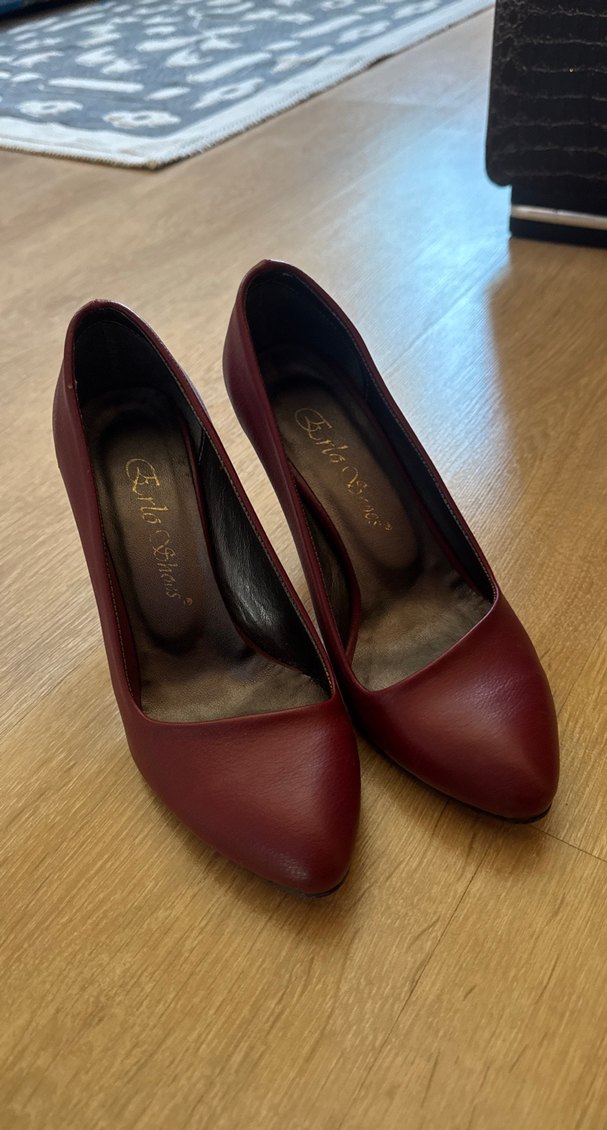 Bir kere düğünde giydim Bordo deri stiletto, parlak yüzey ve blok topuk ile romantik akşamlar için zarif ve şık bir seçim