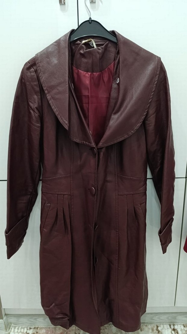 yakası çıkarılabilir. 38 40 beden. Bordo renkte, uzun deri kadın ceket, Uzun kollu, rahat kesim ve deseniz. Ofis ve günlük sokak stili için uygun, Paris tarzında.