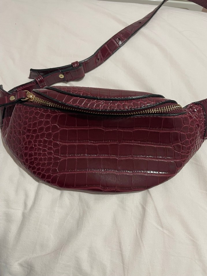 Bordo renk deri kadın çanta, kemerli ve yılan desenli. Günlük kullanıma uygun, trend sokak stiline uyum sağlar.