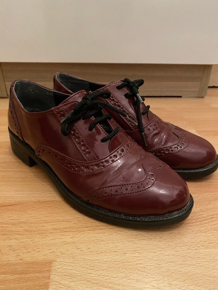 Bordo deri klasik kadın ayakkabısı, blok topuklu ve tokalı tasarıma sahiptir. Ofis için uygun, koyu renkte ve bağcıklı detaylıdır. Bambi