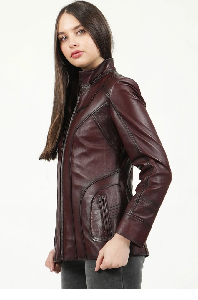 Bordo deri, kürklü yakalı ve kollu, günlük kullanıma uygun, vücuda oturan biker tarzı kadın ceketi.
