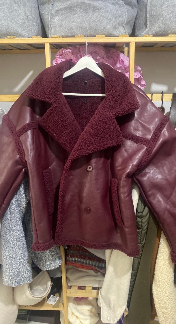 Bordo deri ceket, kürk detaylı ve notched lapel yakalıdır. Salaş kesim ve uzun kolludur, sokak stili için uygundur.