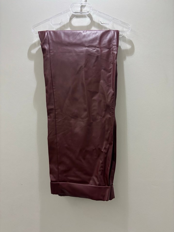 Bordo renkli, deri kumaştan yapılmış, drapeli ve midi boyda, minimal ve şık bir ofis stiline uygun, dar kesim kadın pantolonu.