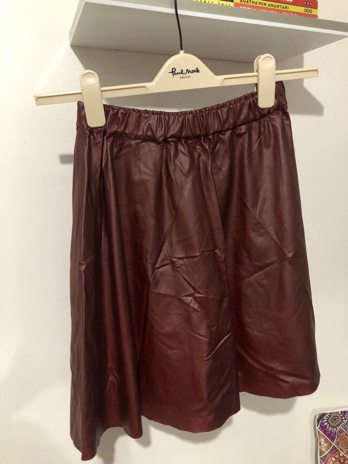 Bordo renk, deri midi şort, bol kesim ve drapeli tasarıma sahip. Günlük sokak stili için uygun, rahat ve şık.
