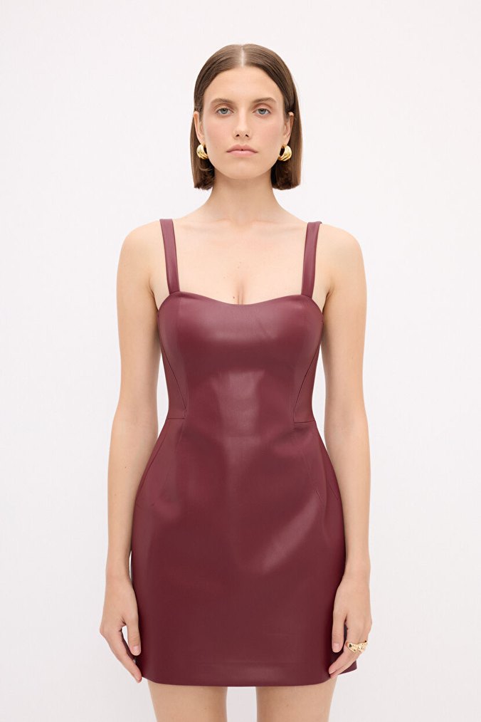 Bordo deri mini elbise, askılı ve kolsuz tasarımıyla parlak ve minimalist bir görünüm sunar, romantik akşamlar için uygundur.