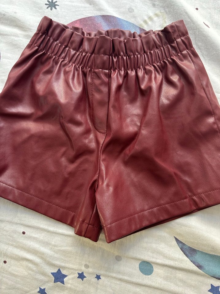 Bordo deri mini şort, bol kesim ve parlak yüzeye sahip. Sokak stili ve zahmetsiz şıklığı bir arada sunar. Romantik akşamlar için uygun. ❤️