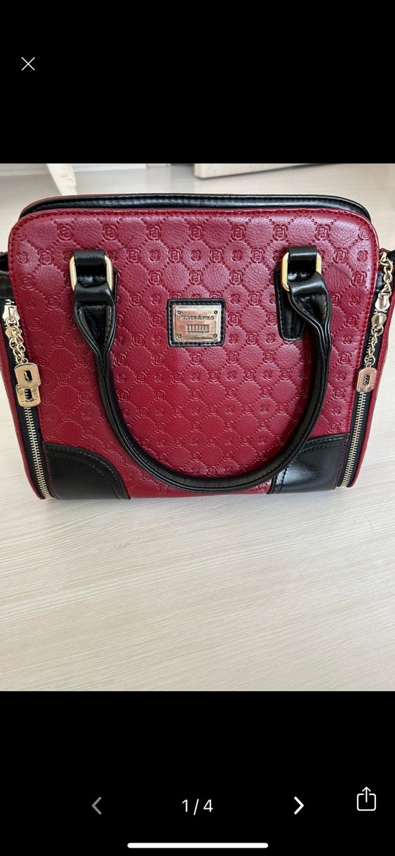 Parlak bordo deri, baskılı desenli ve siyah saplı kadın çantası. Fermuarlı yan detayları ve modern klasik tasarımıyla günlük kullanıma uygun.