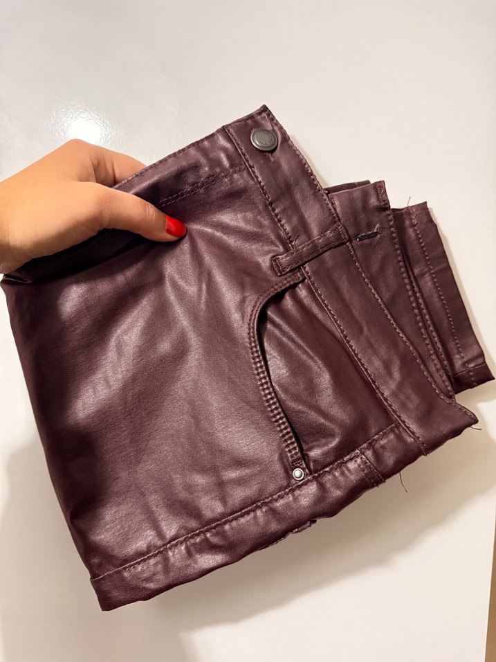 Fermuarlı cepleriyle bordo deri, midi boy, sokak stilinde, günlük kullanıma uygun dar kesim kadın pantolon.