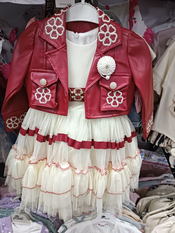 Nakışlı çiçek detaylı bordo deri ceket ve bordo detaylı, fırfırlı krem elbise. Elbise ince askılı ve yakası kesimli.