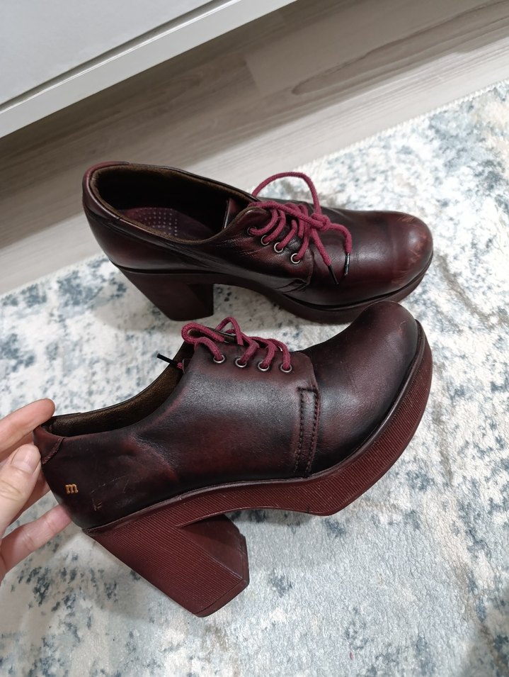 Bordo deri kadın oxford ayakkabılar, platform topuk ve tokalı detaylara sahiptir. Koyu renkli ve desensiz tasarımı vintage ve gotik tarzda romantik akşamlar için uygundur.