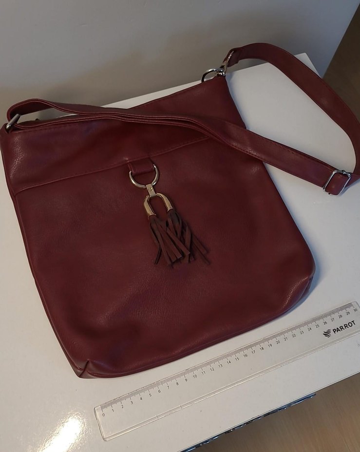 Bordo deri, parlak yüzeyli kadın çanta, püskül detaylıdır. Desensiz, bohem tarzda günlük kullanıma uygundur.