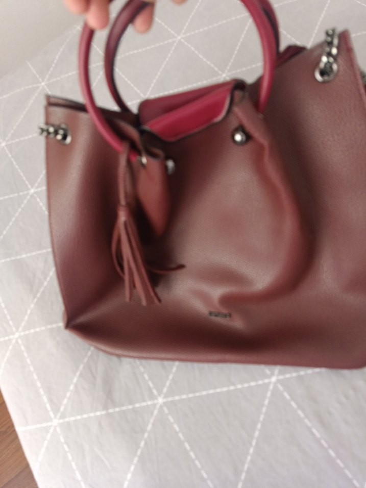 Bordo renk, deri malzemeden yapılmış, püskül detayı ve parlak yüzeye sahip kadın çantası. Sokak tarzı ve günlük kullanım için uygun, minimalist ve trend.