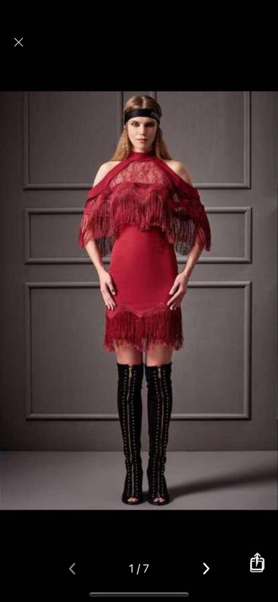 Bordo deri mini elbise, straplez yaka ve işlemeli püskül detaylarıyla dikkat çekiyor. Cesur, gotik parti tarzına uygun.