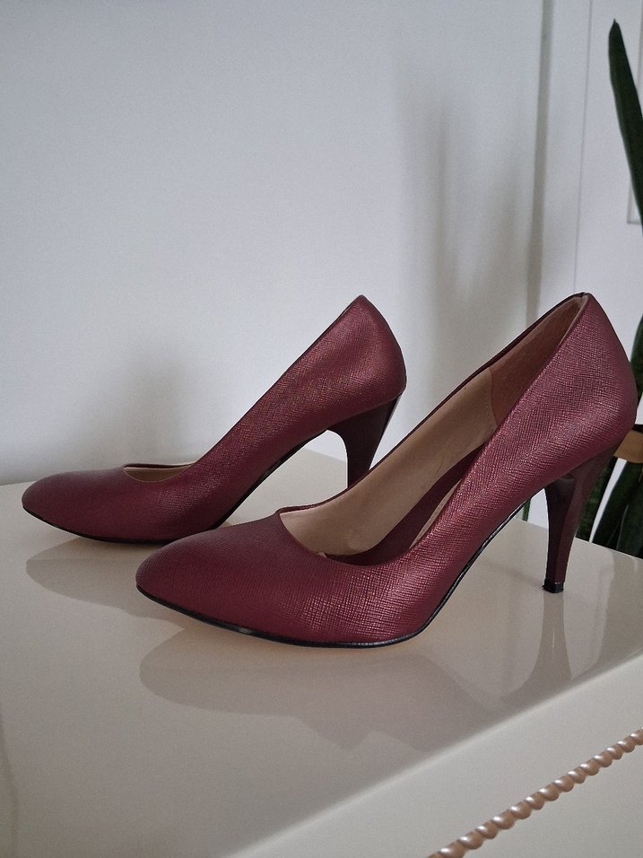 Bordo deri stiletto topuklu ayakkabılar, parlak yüzeyi ve klasik kesimiyle ofis için uygundur. Zahmetsiz şıklık ve çağdaş stil sunar.