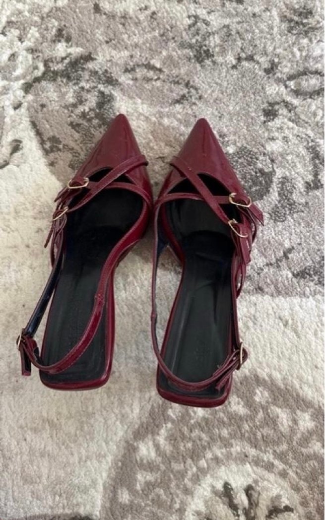 Bordo deri, tokalı bantlı, sivri burunlu stiletto ayakkabılar, romantik akşamlar için uygun.günlük kullanım için de uygun ..