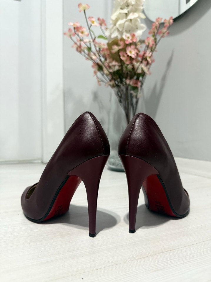 Bordo deri stiletto topuklu kadın ayakkabı, şık silueti ve yüksek topuklarıyla romantik akşamlar için zahmetsiz şıklık sunar.