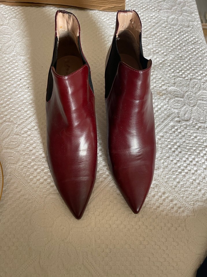 Bordo deri kadın botları, stiletto topuk ve tokalı detayıyla şık ve çağdaş bir görünüm sunar, ofis kullanımı için uygundur.topuk boyu 5cm dir