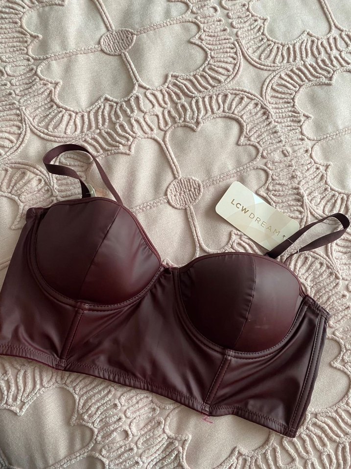 Bordo deri, ve straplez yaka detaylı bustiyer. İnce askılı ve vücuda oturan kesimiyle cesur bir tarz sunar. ❤️