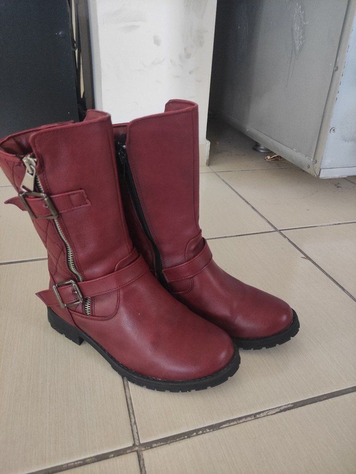 Koyu bordo deri biker botlar, tokalı detaylar ve yan fermuar ile, şık ve rahat bir görünüm sunar.