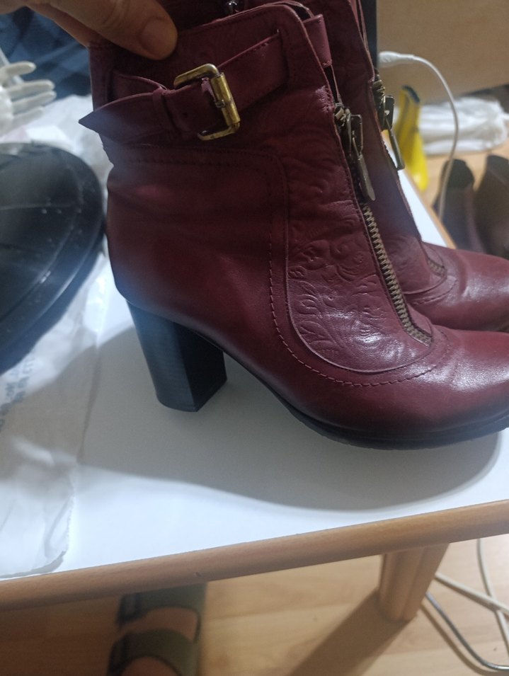 Bordo renkte, tokalı ve ön fermuarlı kadın deri botları. Blok topuklu, şık ve günlük kullanıma uygun. Hafif kabartmalı deseni bulunur.