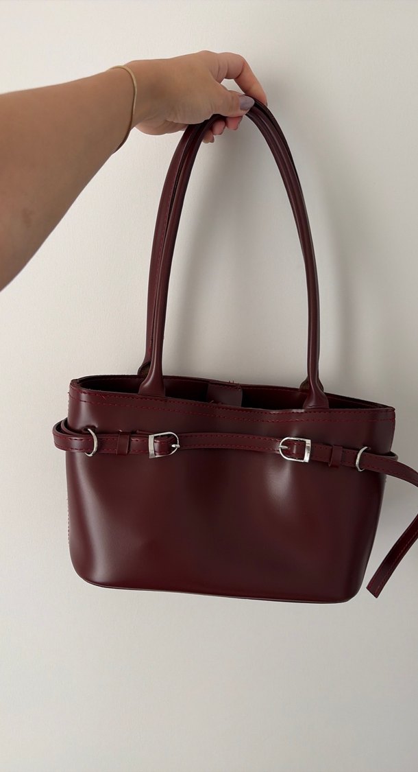 Bordo deri tokalı kadın çanta, minimal ve modern klasik tarzda, günlük kullanıma uygun şık bir modeldir.