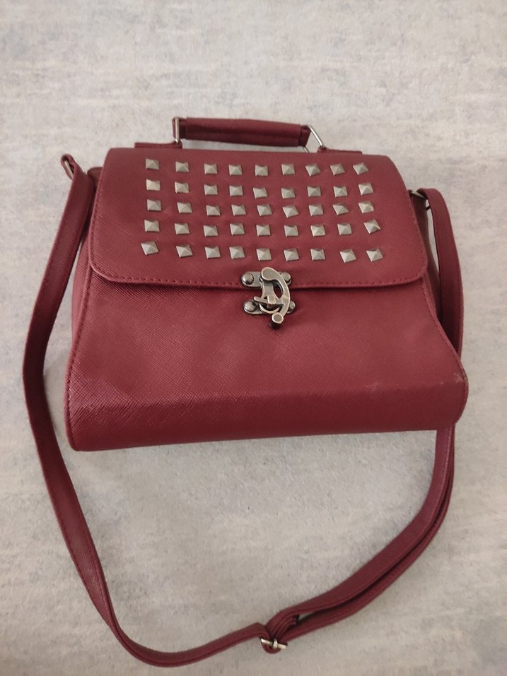 Bordo deri çanta, tokalı kapama ve kapakta gümüş renkli metal detaylarla minimal rock punk tarzını yansıtıyor. Parlak yüzeyli, günlük kullanıma uygun.