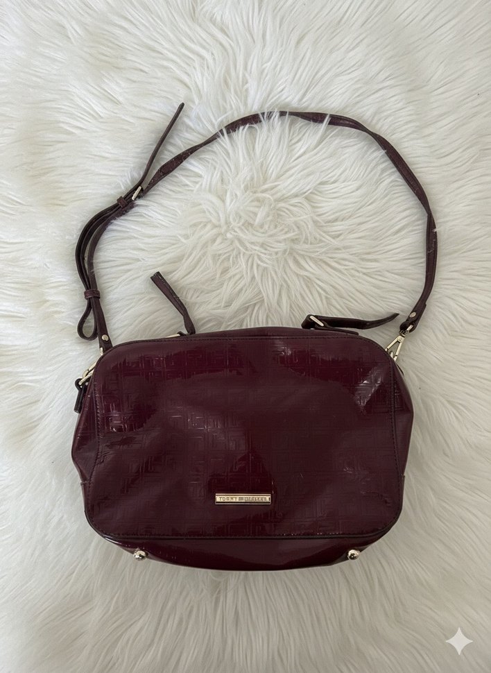 Bordo renkli orijinal Tommy Hilfiger marka çanta. İç etiketlerini ekledim, rugan parlak kumaş. Önünde bir leke var ve askılarda deforme var, askısı değiştirilip kullanılır. Fiyatını yine de uygun tutuyorum.