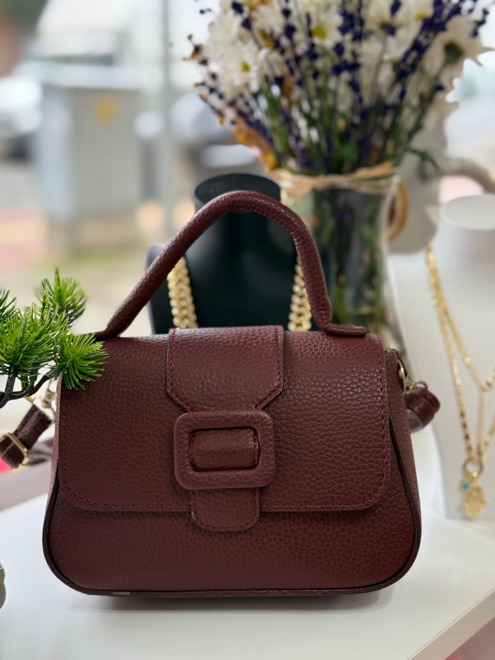 Bordo deri tokalı, minimal ve modern klasik tasarıma sahip kadın çanta, günlük kullanıma uygun ve şık görünüyor.
