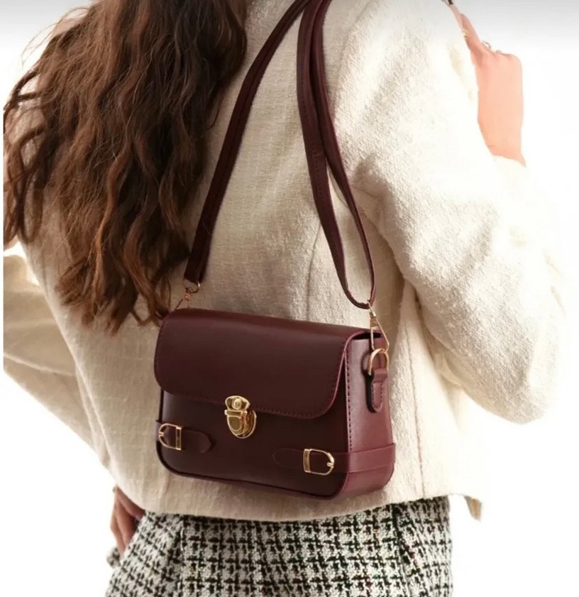 Bordo deri tokalı kadın çantası, modern klasik tarzda, günlük kullanıma uygun. Koyu renkte ve desensiz, trend günlük görünüme sahip.