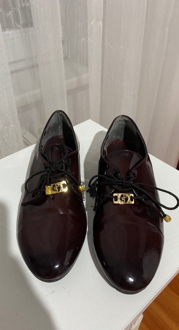 Bordo deri kadın klasik ayakkabılar, blok topuklu ve tokalı detaylara sahip, ofis kullanımı için uygun. Düz ve koyu renklidir, bağcıklı tasarım sunar.