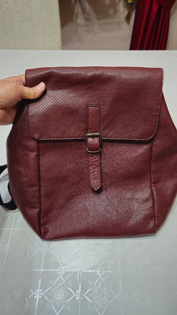Bordo deri sırt çantası, tokalı kapak ve parlak yüzeye sahiptir. Minimalist ve günlük sokak stiline uygundur.