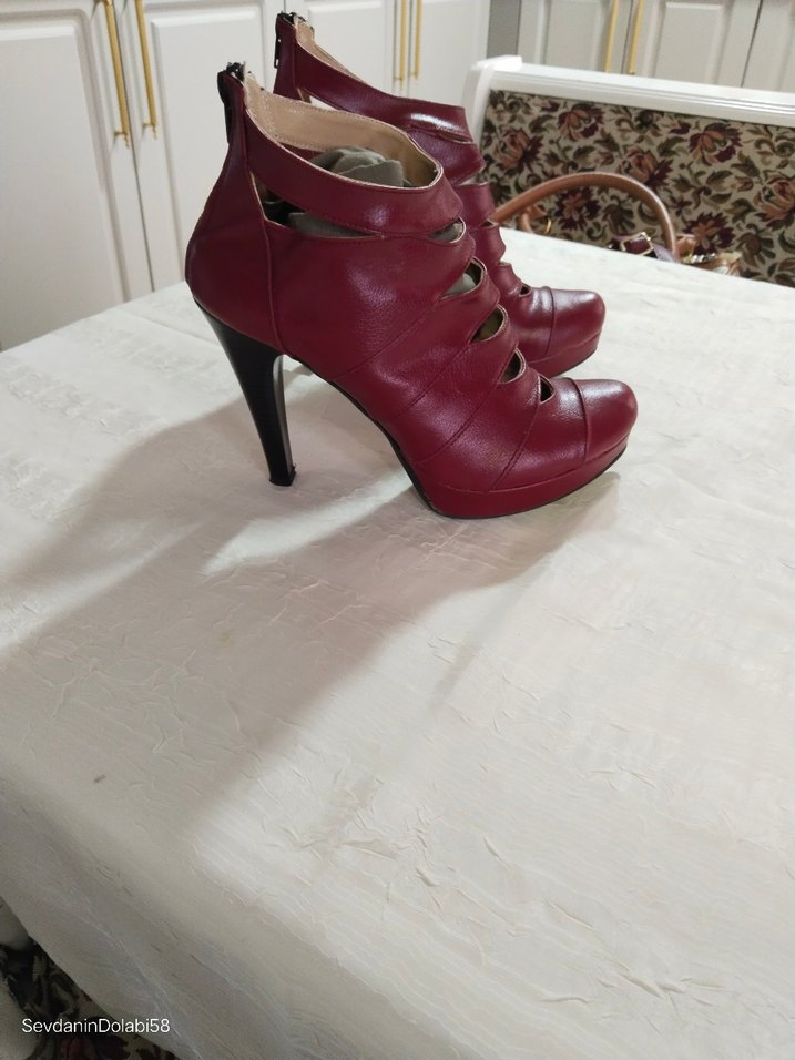 Bordo deri stilettolar, yüksek topuk ve tokalı kayışlarla modern ve cesur Paris tarzını yansıtıyor, romantik akşamlar için ideal. Topuk Kısmında Hafif İnce Bir Sürtünme Vardır Onun Dışında Hiç Bir problemi yoktur temizdir. Fotoraftaki Çanta İle Çok Şık Bir Kombin Olabilir.
