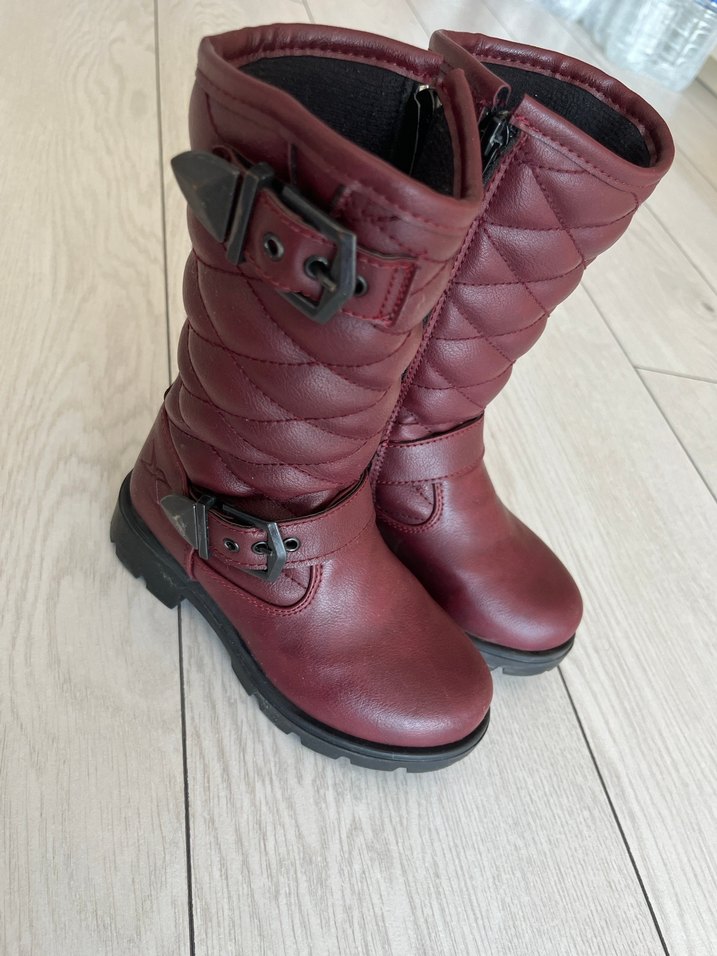 Bordo renkte, deri malzemeden yapılmış, tokalı ve kapitone detaylı kız çocuk biker çizmesi. Yan fermuarlı ve dayanıklı tabanlıdır.