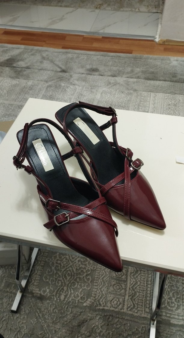 Bordo deri stiletto, sivri burun ve tokalı kayışlarla minimal ve cesur bir tarz sunar. Günlük kullanım için uygundur.