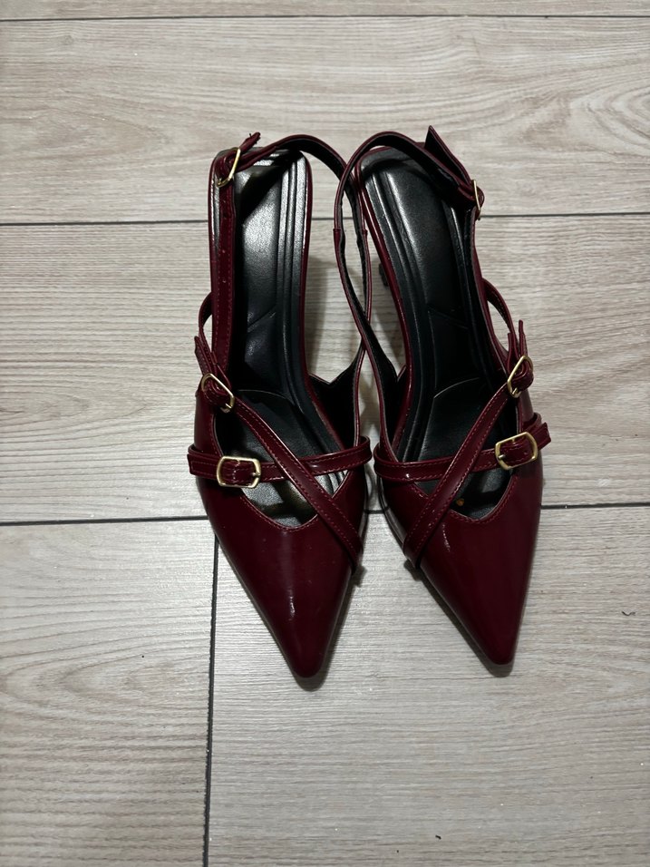 Bordo deri tokalı stiletto kadın ayakkabı, sivri burunlu ve şık modern klasik tasarıma sahiptir, günlük kullanıma uygundur.